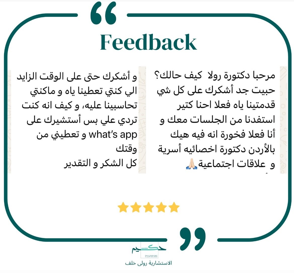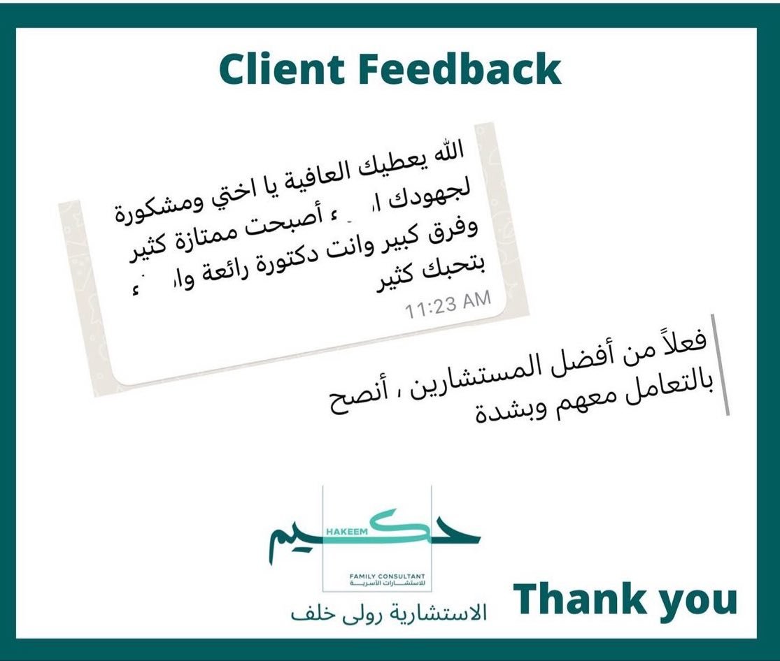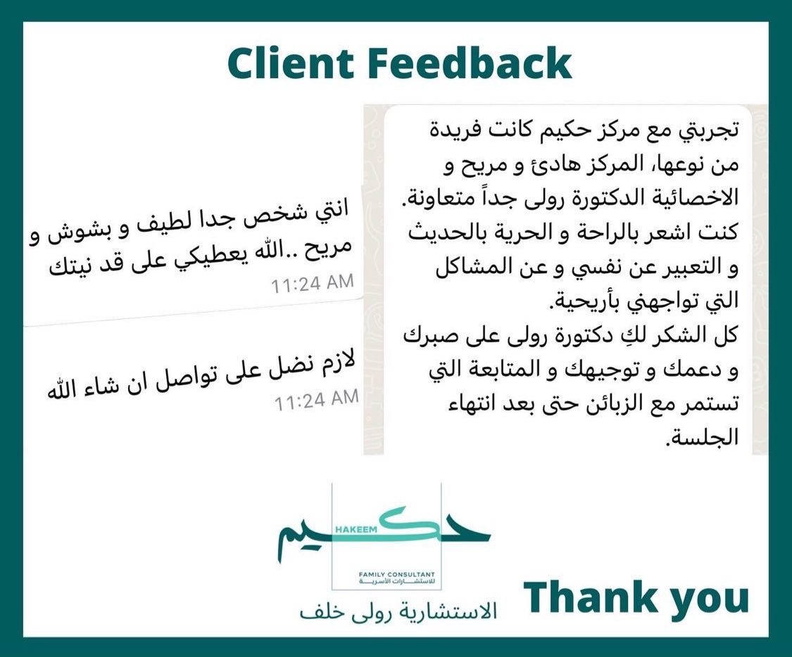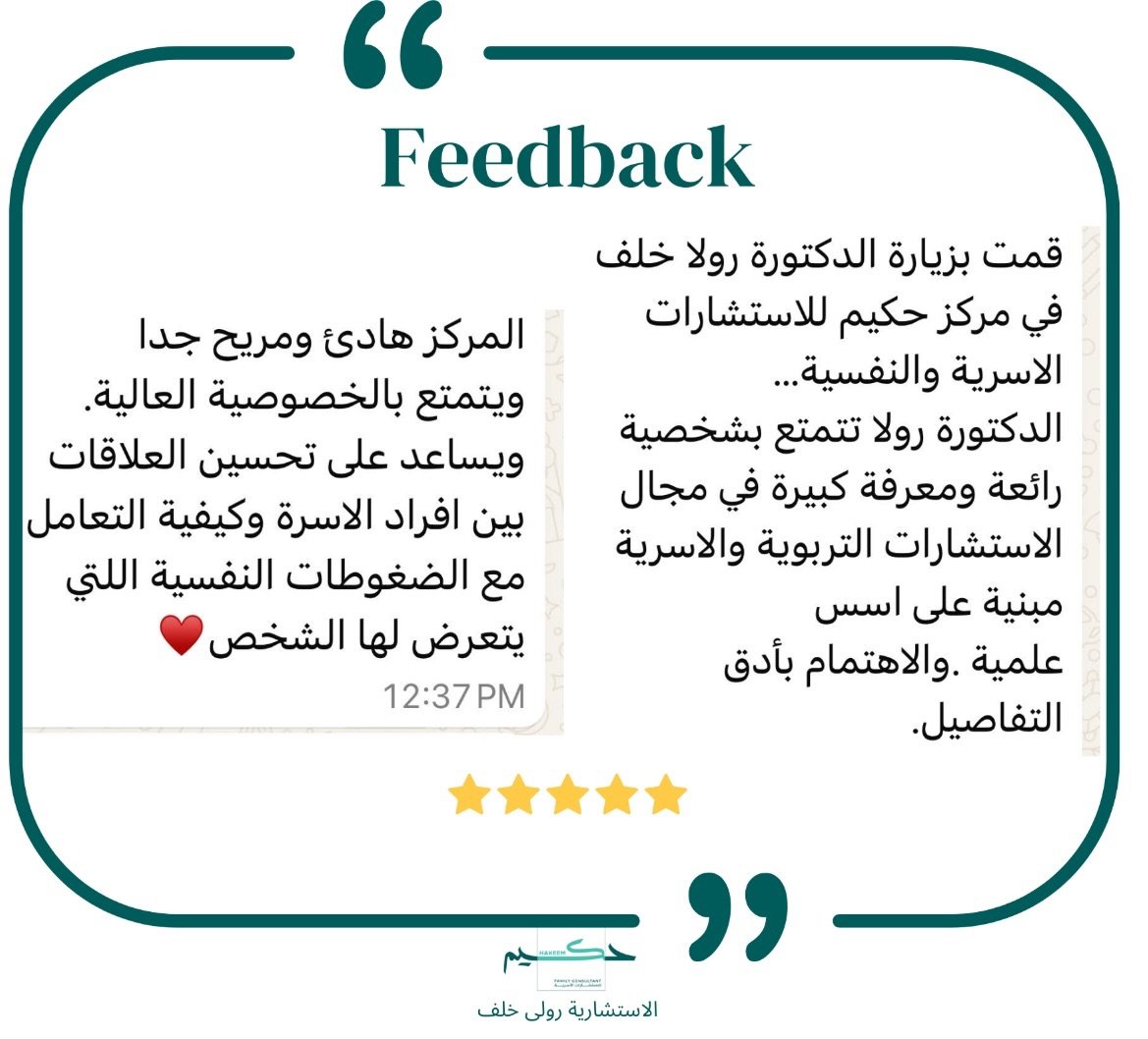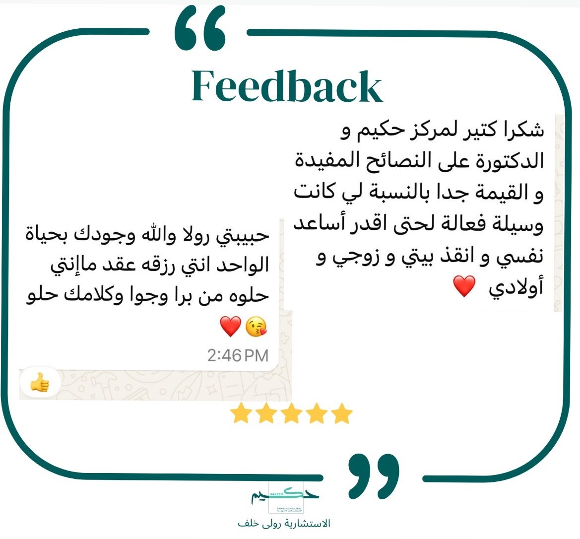 ﻣﺮﻛﺰ ﺣﻜﻴﻢ ﻟﻼﺳﺘﺸﺎرات اﻻﴎﻳﺔ واﻟﻨﻔﺴﻴﺔ ﻳﻀﻢ ﻧﺨﺒﺔ ﻣﻦ اﳌﺨﺘﺼﲔ ذوي اﻟﺨﱪة ﰲ ﻣﺠﺎل اﻟﺼﺤﺔ اﻟﻨﻔﺴﻴﺔ.